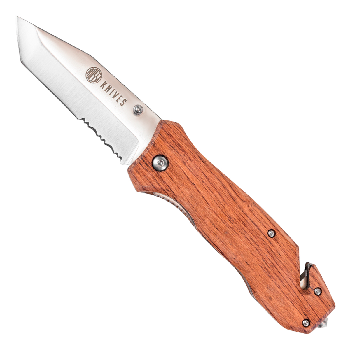 Seu principal destaque é o cabo elegante em madeira de Jacarandá, que oferece uma pegada confortável e um acabamento único. A lâmina é feita de aço inoxidável 420, um material durável e resistente à corrosão, ideal para diversas tarefas.